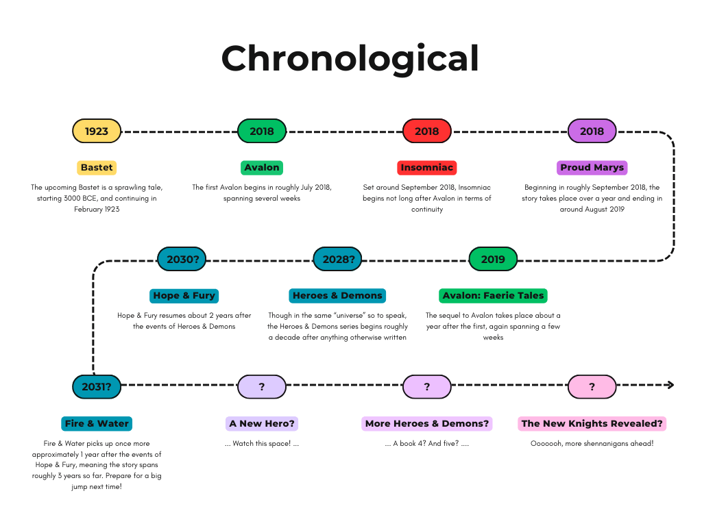 One little note, though the upcoming Bastet is primarily set in Egypt in both 3000 BCE and 1923, it is told over a cold martini (and like a few cigarettes) in modern times and thus can be slotted in between Avalon: Faerie Tales and Heroes & Demons if you really wish (or read first if you like). Again, the below diagram should help!