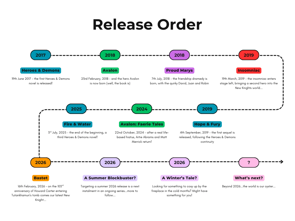 2. Chronological Order – if you prefer to understand the novels in the order they are set then a word of warning – there’s many books to be released in all sorts of places! This might be a better option for people who want to reread (I’m a big re-reader myself, some of my spines have been tortured more than a chiropractor’s). But anyway, here we go. We start with Avalon which begins around July 2018, with Insomniac set a few months later in September 2018. Proud Marys covers the year from August 2018 to August 2019 so might be best to read next. We then return to the world of Artie Abrams with Avalon: Faerie Tales, which picks up approximately one year afterwards in around September 2019. The Heroes & Demons books have continuity around a decade afterwards, so can be covered Heroes & Demons, Hope & Fury and Fire & Water in one go.