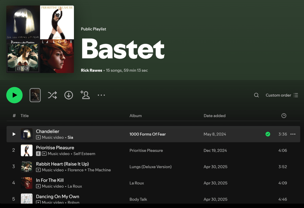 Once again, this new novel comes with it’s own playlist of songs that inspired the writing of it. However, the mood is not one of 1920s flappers and wartime ragtime – this is an out of time and out of the chaos kind of a playlist. Songs evoke mood as a simple act of defiance – a celebration of power and vulnerability, as well as the kind of mythic resonance only a God can bring to the party. Florence pairs with Sia, swinging through Self Esteem and Amy Winehouse. Robyn pops up with a wild bit of LaRoux and even some Halestorm. The sound is one of cosmic emotion, grand in scale and attitude – and I find myself coming back to it even after the writing is done.